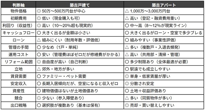 以下の表は、「築古戸建て」と「築古アパート」を14項目で比較したものです。