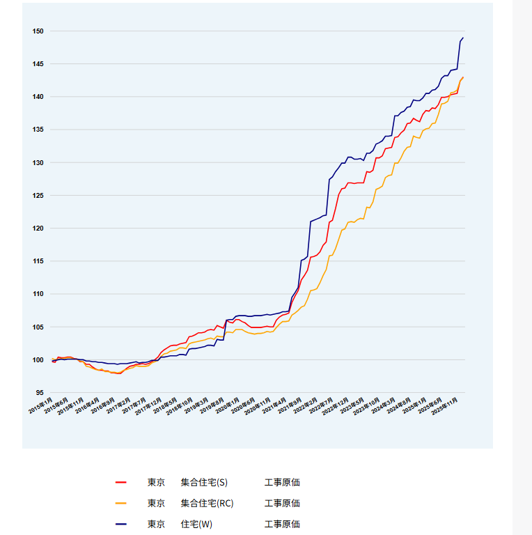 以下は、「鉄骨造・木造・鉄筋コンクリート造」の建築費指数の推移を表したものですが、2025年末時点で、10年前より(2015年比)およそ1.5倍まで高騰しています。