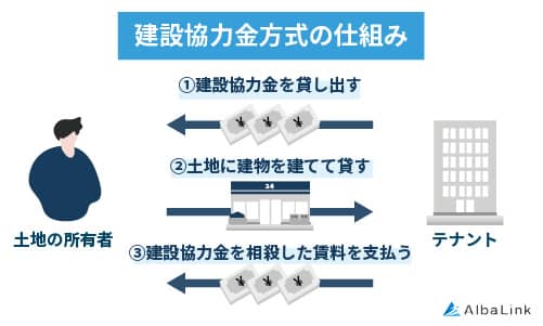 建設協力金方式は、土地所有者(貸主)が出店を希望するテナント企業 (借主)から建設資金を無利息あるいは低金利で借り受け、その資金で店舗や施設を建ててテナントに賃貸する土地活用法です。